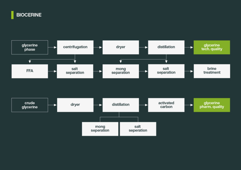 Production of high-margin glycerin with purity ranging from 86.5% to 99.7%, including kosher glycerin, sourced from sustainable plant-based raw materials.